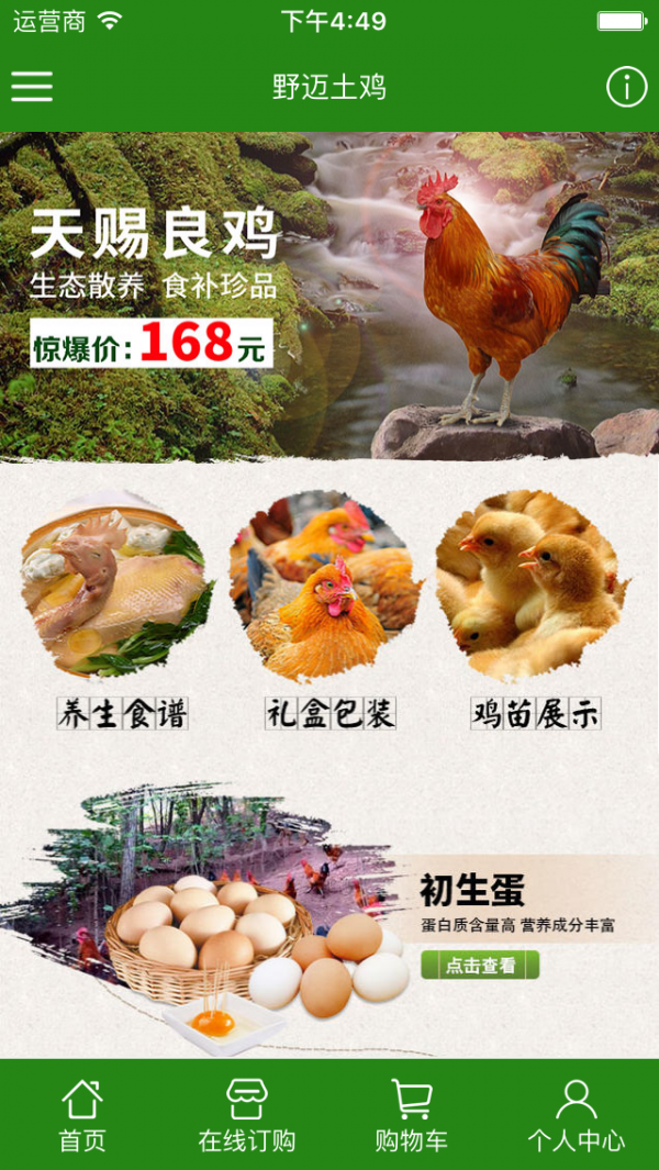 野迈土鸡客户端是一款实用性信息平台,集养生食谱、礼盒包装、鸡苗展示、初生蛋、养殖农场、技术加盟、野迈简介和在线订购等功能于一体。野迈土鸡客户端以其便捷的浏览方式、强大的应用功能,以及最新的资讯信息为广大客户展示一个丰富多样的信息平台。