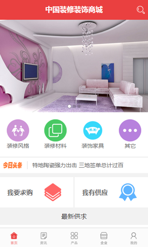 中国装修装饰商城app是一款网络购物应用,在这里用户不懂可便捷的选购商品,还能及时了解行业资讯,产品促销活动信息等。