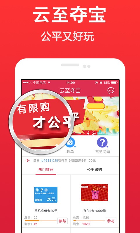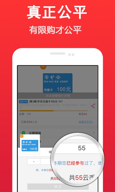 「公平限购」专区,所有人参与额度相同,中奖率更高,助您更快夺到宝!