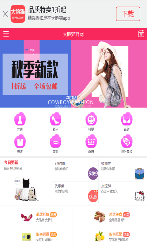 大脸猫app折扣汇聚全网最优质折扣商品,每日精选千款超值折扣商品9.9元起全场包邮1折特卖,每天10点限时秒杀!上大脸猫购便宜!