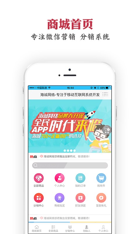 海诚超级商城是一个基于微信公众号为载体,帮助企业实现线上线下互通(o2o),社会化客户关系管理(SCRM),移动电商,轻应用APP等多个层面的业务开发,目前深入挖掘的行业有电商、餐饮、汽车、房产、婚庆、商超、快消、美容、影楼等数百个行业解决方案。