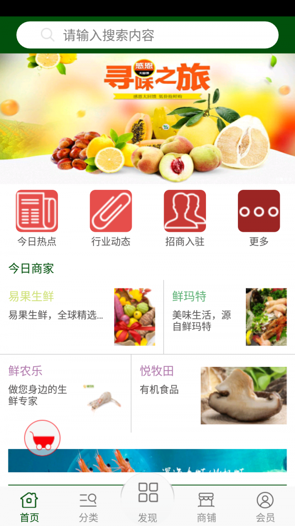 生鲜食品网是一个专业的购物网络平台,随时为你提供最新资讯,产品展示,招商袋里等信息,该客户端现面向全国招商,各大企业可以在该客户端上发布供求信息,发布广告,发布行情,让各大企业及广大客户更为便捷,该客户端向广大客户展示了一个大型的移动互联网门户平台,以便捷的浏览方式,强大的应用功能,最新的应用资讯信息,为广大客户提供了一个丰富的信息平台。