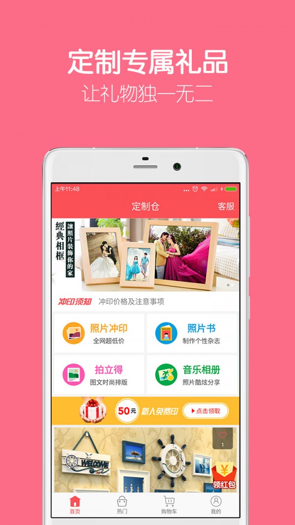 定制仓app是一款个性定制商城应用软件,下载定制仓app,就可以快速冲印手机照片,定制专属礼品,还可以在线购买高品质配件,让您的照片变得美美哒!