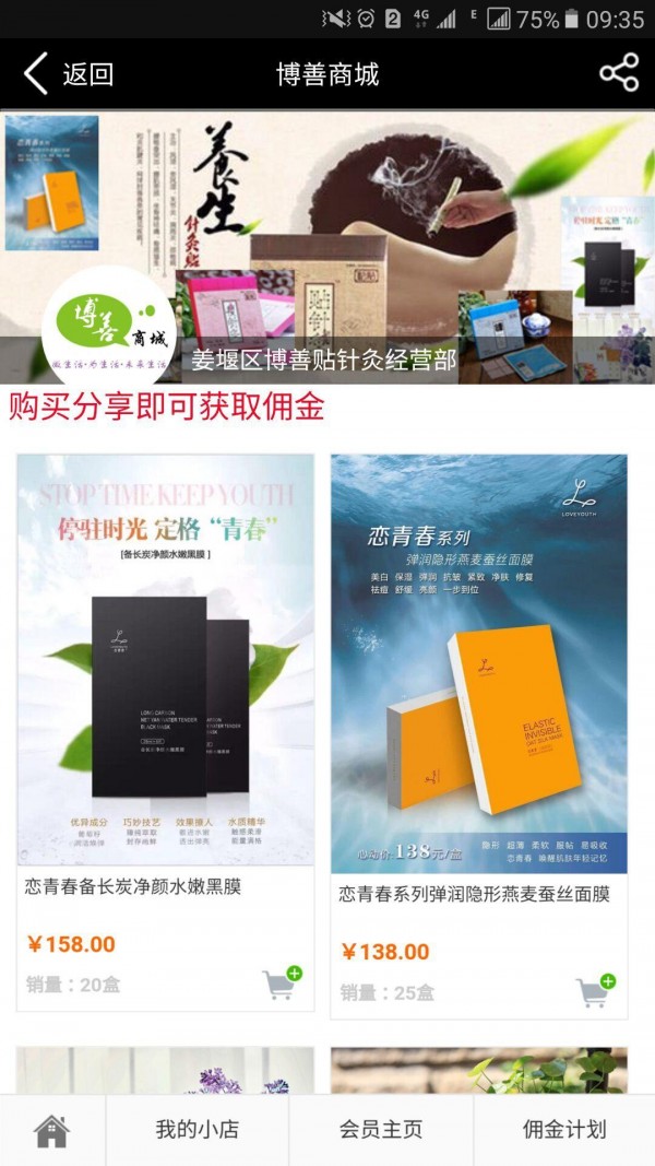 博善商城APP首页包括我的小店、会员主页、佣金计划三大板块,用户可以在线申请成为会员,开通分销商即可分享赚佣金。