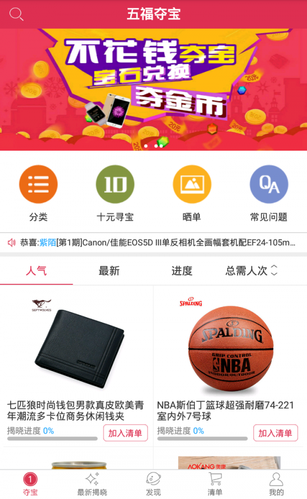 五福夺宝app是一款夺宝购物软件,通过五福夺宝app,只需1元就能参与夺大奖,花1元给自己一份惊喜,你值得拥有!