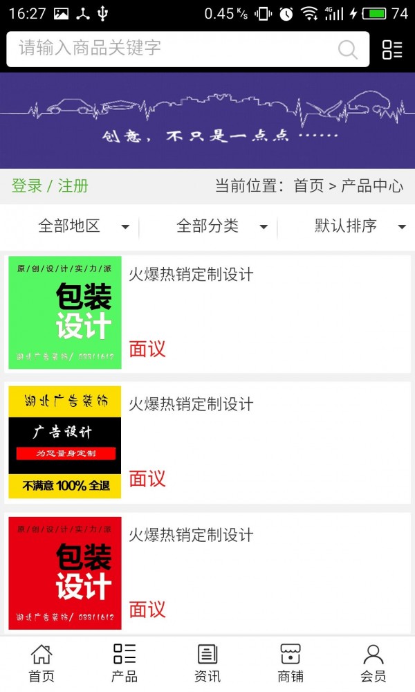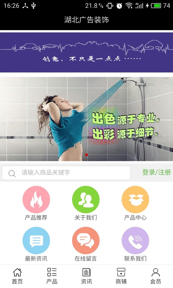 湖北广告装饰客户端不仅具备购物、查询订单、搜索商品、行业资讯和产品评价等常用功能,而且还实现了手机版特有的会员注册登陆、广告位、招商开店等功能。