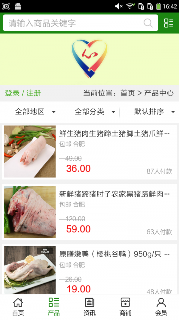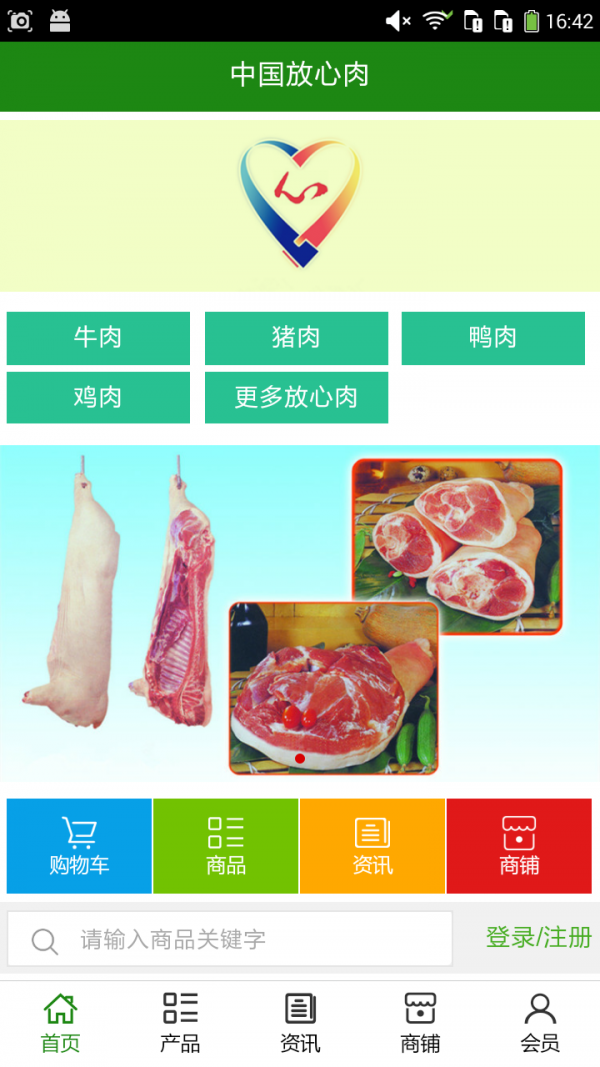 放心肉客户端不仅具备购物、查询订单、搜索商品、行业资讯和产品评价等常用功能,而且还实现了手机版特有的会员注册登录、广告位、招商开店等功能。