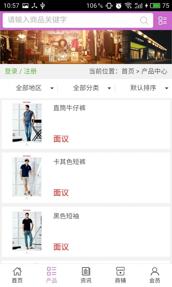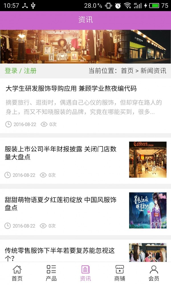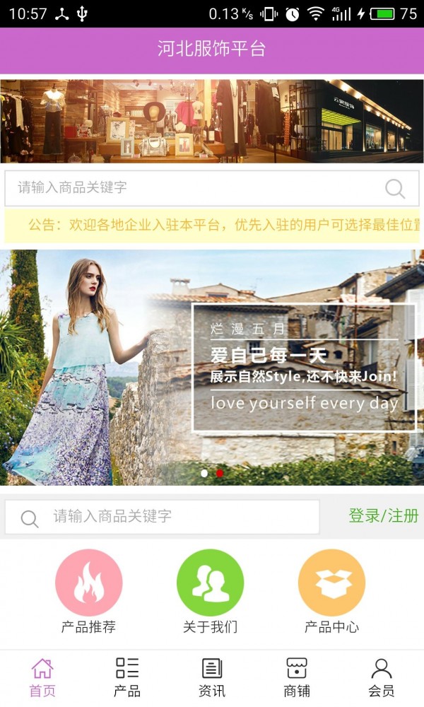 河北服饰平台客户端不仅具备购物、查询订单、搜索商品、行业资讯和产品评价等常用功能,而且还实现了手机版特有的会员注册登陆、广告位、招商开店等功能。