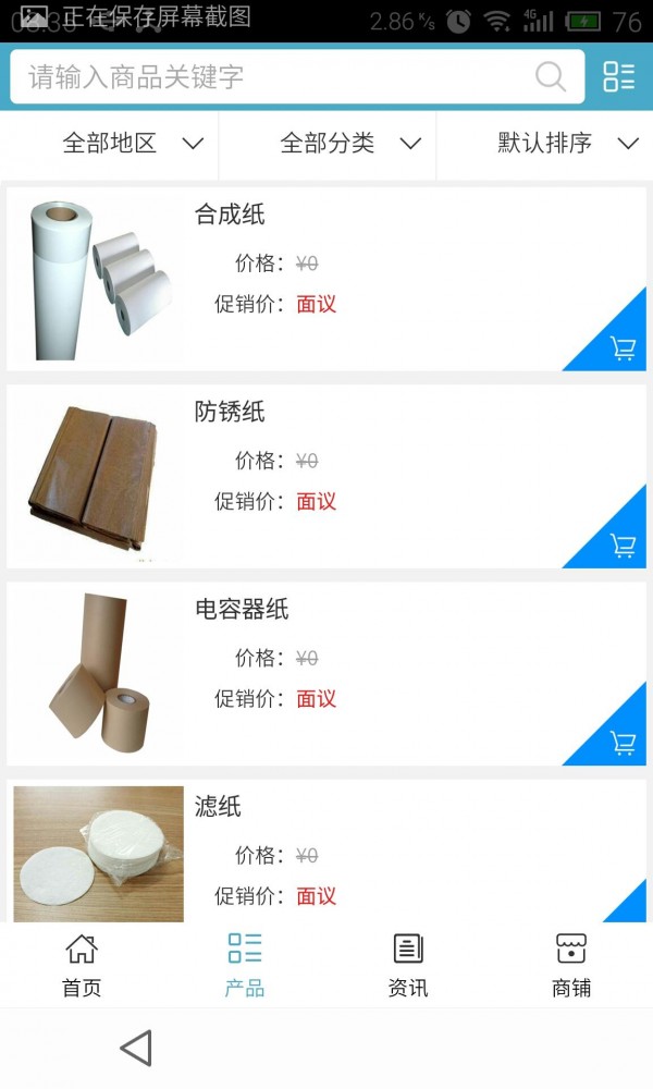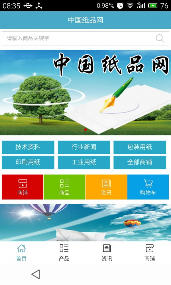纸品网客户端不仅具备购物、查询订单、搜索商品、行业资讯和产品评价等常用功能,而且还实现了手机版特有的会员注册登录、广告位、招商开店等功能。
