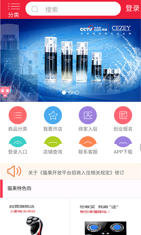 猫果网app是一款网络购物应用,汇聚全国精品,精确分类,为用户提供正品保证的购物服务,更有限时抢购专区,百万精品等你来,为你打造省钱购物方式!