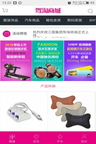 驾淘商城app是一个集综合商城、本地生活、驾校行业应用为一体的综合类应用。商城涵盖服装饰品、汽车用品、箱包皮具、数码家居、DIY定制、特产商城等。
