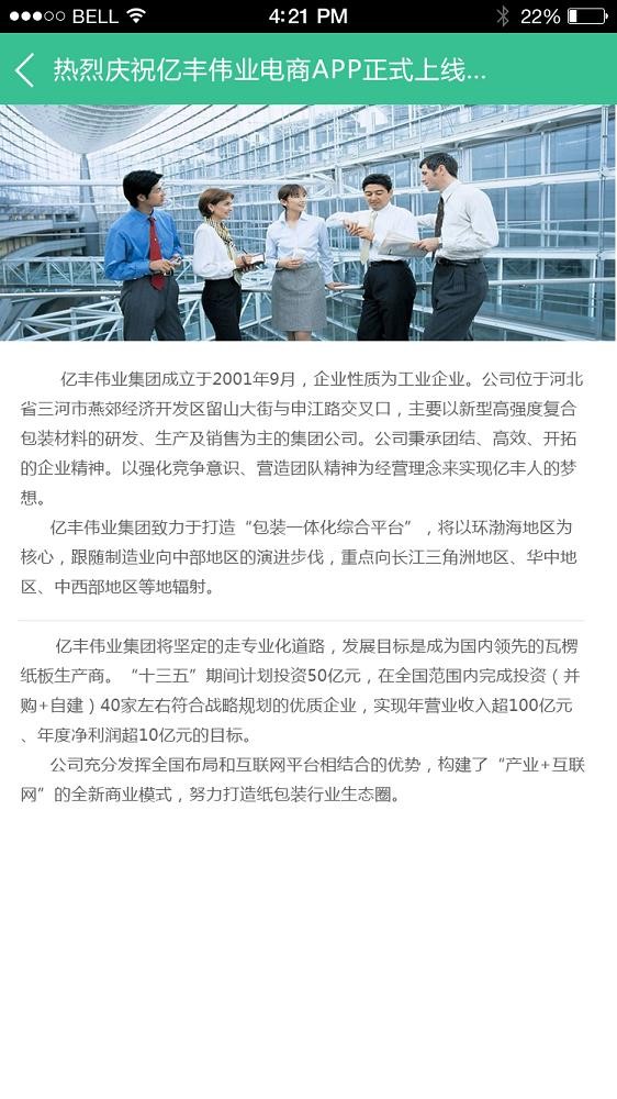 亿丰伟业集团成立于2001年9月,企业性质为工业企业。公司位于河北省三河市燕郊经济开发区留山大街与申江路,主要以新型高强度复合包装材料的研发、生产及销售为主的集团公司。公司秉承团结、高效、开拓的企业精神。以强化竞争意识、营造团队精神为经营理念来实现亿丰人的梦想。亿丰伟业集团致力于打造“全球领先的瓦楞产品服务商”,将以环渤海地区为核心,跟随制造业向中部地区的演进步伐,重点向长江三角洲地区、华中地区、中西部地区等地辐射。