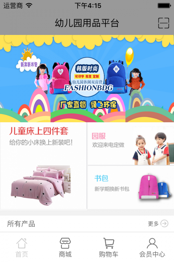 幼儿园用品平台app是一款专注于幼儿园用品在线购买的软件,通过幼儿园用品平台app你可以便捷的购买孩子需要的幼儿园用品。