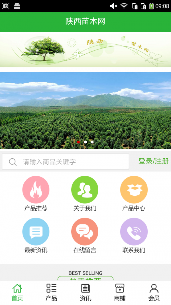 陕西苗木网APP不仅具备购物、查询订单、搜索商品、行业资讯和产品评价等常用功能,而且还实现了手机版特有的会员注册登录、广告位、招商开店等功能。目标是整合当地品牌商、生产商、经销商,为商家和消费者之间提供一站式解决案。