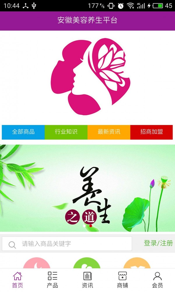 安徽美容养生平台客户端不仅具备购物、查询订单、搜索商品、行业资讯和产品评价等 长用功能,而且还实现了手机版特有的会员注册登陆、广告位、招商开 店等功能。
