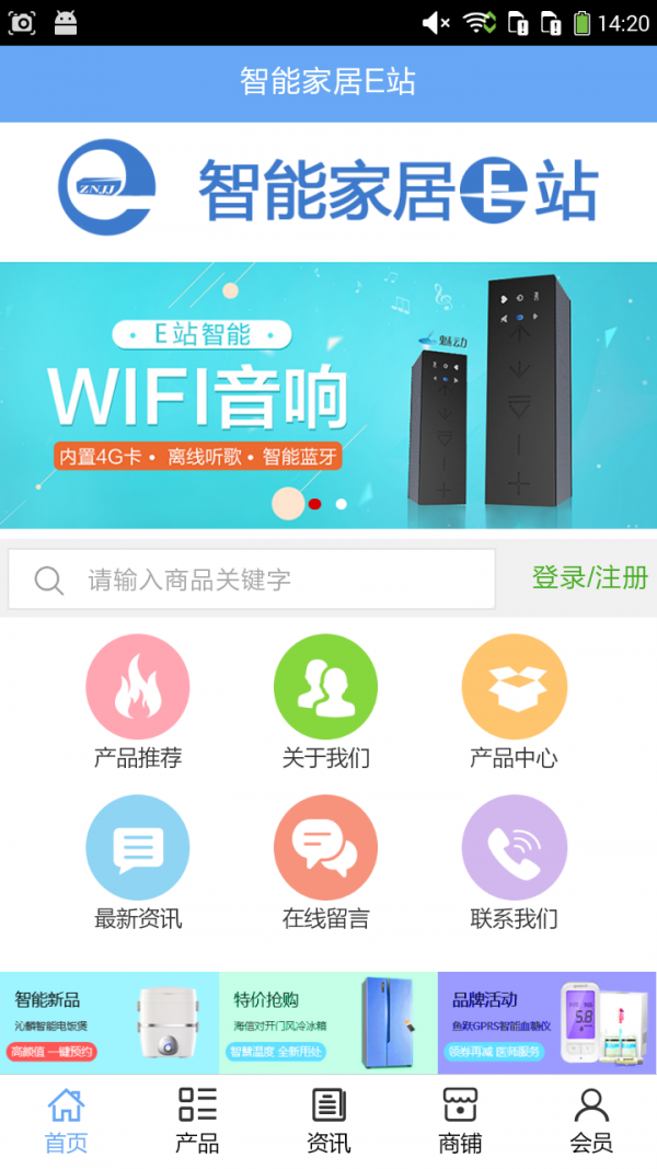 智能家居E站app不仅具备购物、查询订单、搜索商品、行业资讯和产品评价等常用功能,而且还实现了手机版特有的会员注册登录、广告位、招商开店等功能。目标是整合当地品牌商、生产商、经销商,为商家和消费者之间提供一站式解决案。欢迎下载使用!