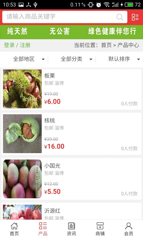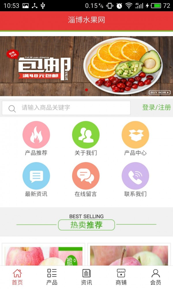 淄博水果网客户端不仅具备购物、查询订单、搜索商品、行业资讯和产品评价等常用功能,而且还实现了手机版特有的会员注册登录、广告位、招商开店等功能。