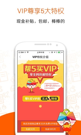 2、包邮费:成为帮5买会员VIP,就能享受1元以上商品全网包邮的服务,单笔订单最高省10元邮费