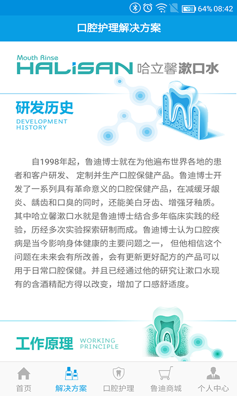 其中哈立馨漱口水就是鲁迪博士结合多年临床实践的经验,历经多次实验探索研制而成。鲁迪博士认为口腔疾病是当今影响身体健康的主要问题之一,但他相信这个问题在未来会有所改善,会有更新更好配方的产品可以用于日常口腔保健。并且已经通过他的研究让漱口水现有的含酒精配方得以改变,增加了口感舒适度。