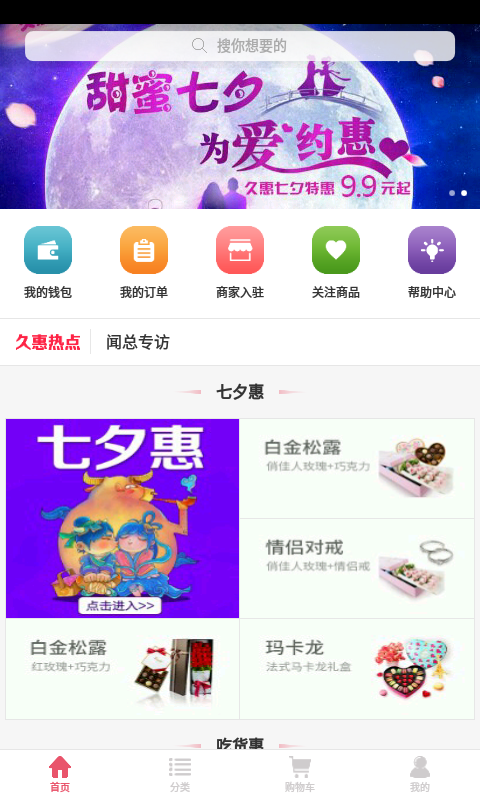 久惠商城1.0版本.这个版本共有:首页.分类,购物车,我的,等四个大模块.有着良好的体验效果,清新的UI风格.