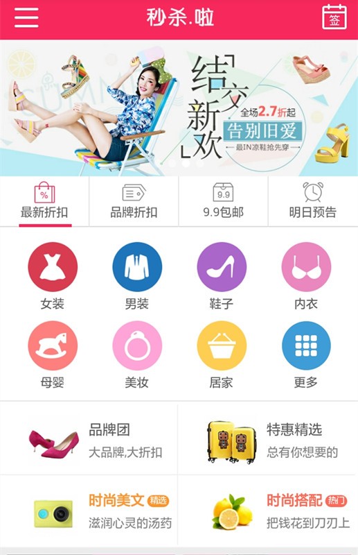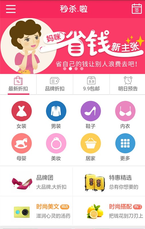 秒杀啦,是一款为您省钱的APP,包含九块九包邮,20元封顶,内部优惠券,品牌团,时尚资讯,积分返红包等功能,是您购物的好帮手,让网购从此不剁手。