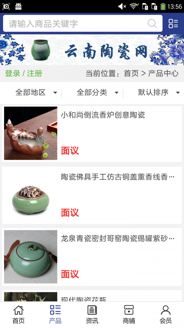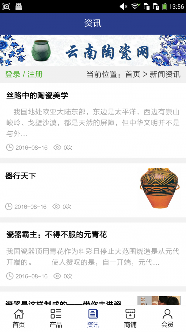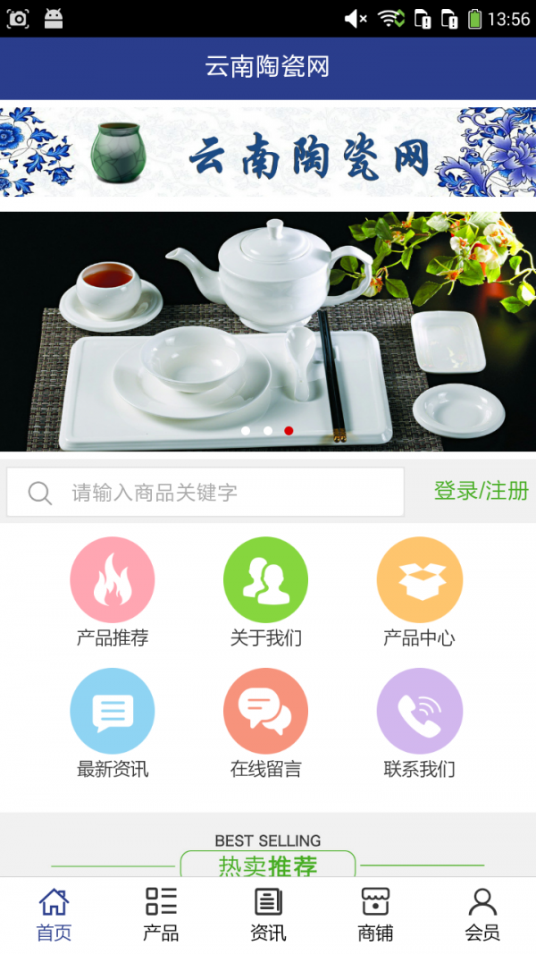 云南陶瓷网客户端不仅具备购物、查询订单、搜索商品、行业资讯和产品评价等常用功能,而且还实现了手机版特有的会员注册登录、广告位、招商开店等功能。