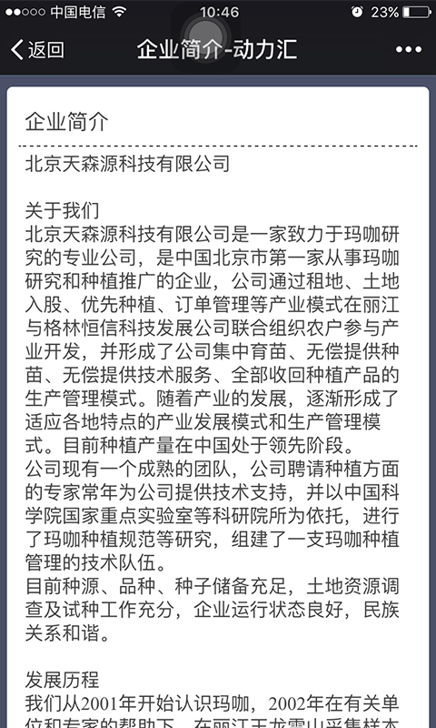 北京天森源科技有限公司是一家致力于玛咖研究的专业公司,是中国北京市从事玛咖研究和种植推广的企业,公司通过租地、土地入股、优先种植、订单管理等产业模式在丽江与格林恒信科技发展公司联合组织农户参与产业开发,并形成了公司集中育苗、无偿提供种苗、无偿提供技术服务、全部收回种植产品的生产管理模式。随着产业的发展,逐渐形成了适应各地特点的产业发展模式和生产管理模式。目前种植产量在中国处于领先阶段。