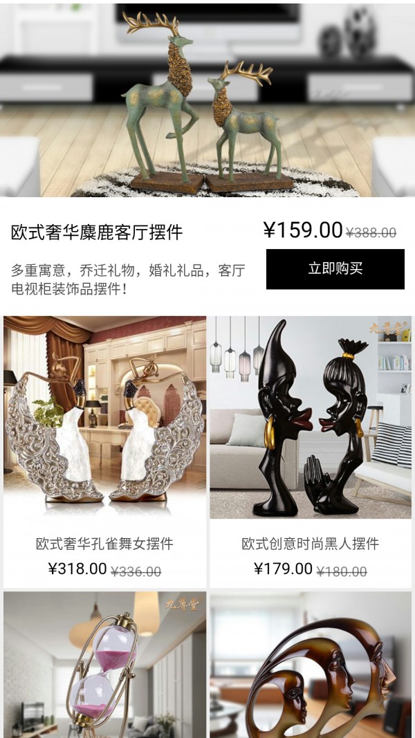 奢华客厅摆饰,主要包括欧式奢华麋鹿客厅摆件,孔雀舞女摆件,创意时尚黑人摆件,七夕时光爱情沙漏摆件,现代简约艺术抽象摆件,马大成功书房创意摆件,曼妙舞姿舞女摆件,陶瓷桐花瓶饰品,客厅电视柜储物罐等。已添加淘宝或天猫客户端下单功能,下单直接到官方旗舰店,安全放心。