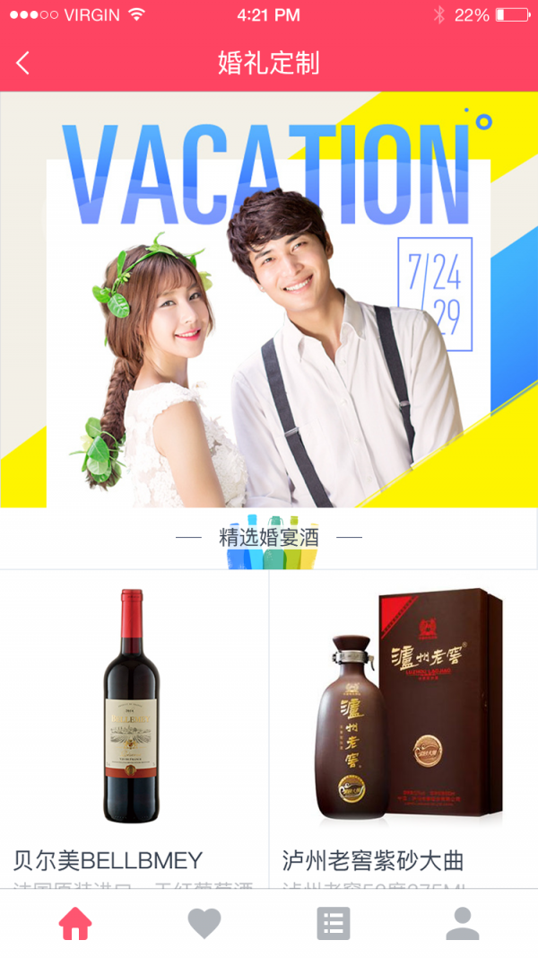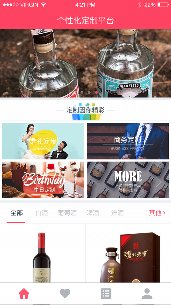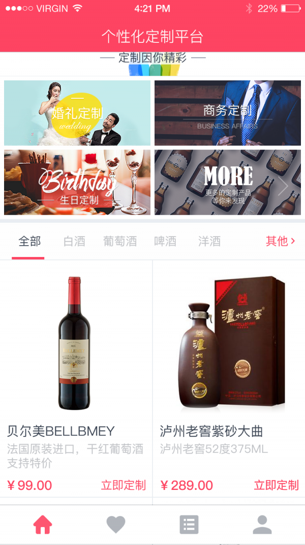 壹加玖定制app以“定制,实现更多可能”为口号,深度整合众多酒类品牌,提供包装定制、酒品定制等个性化服务,开放线上与线下结合的定制平台,以满足个人与企业不同场景定制需求,打造“一对一”式的高品质服务产品。