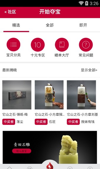 2.夺宝是这三个档次中最新的、充满乐趣与惊喜的购石模式。用户可以浏览APP上夺宝栏目的最新活动,选择心动的石雕,选择支付1元钱,就可获得石雕若干“等份”中的一个编码,当“等份”被全部售出后,系统随机抽取一个编号作为“幸运号”,此“幸运号”的拥有者即可获得这件石雕。