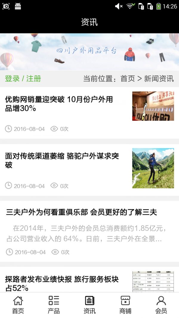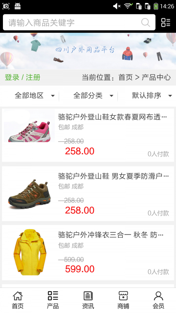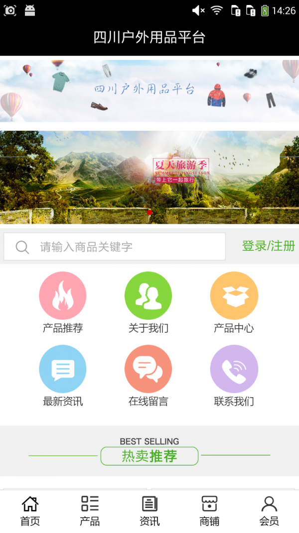 四川户外用品平台不仅具备购物、查询订单、搜索商品、行业资讯和产品评价等常用功能,而且还实现了手机版特有的会员注册登录、广告位、招商开店等功能。目标是整合当地品牌商、生产商、经销商,为商家和消费者之间提供一站式解决案。