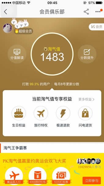 4.淘气值超过1000分的会员就是淘宝的超级会员,现在已有近千万超级会员了,淘宝准备了大量专属权益送给这些最‘淘’的人呦