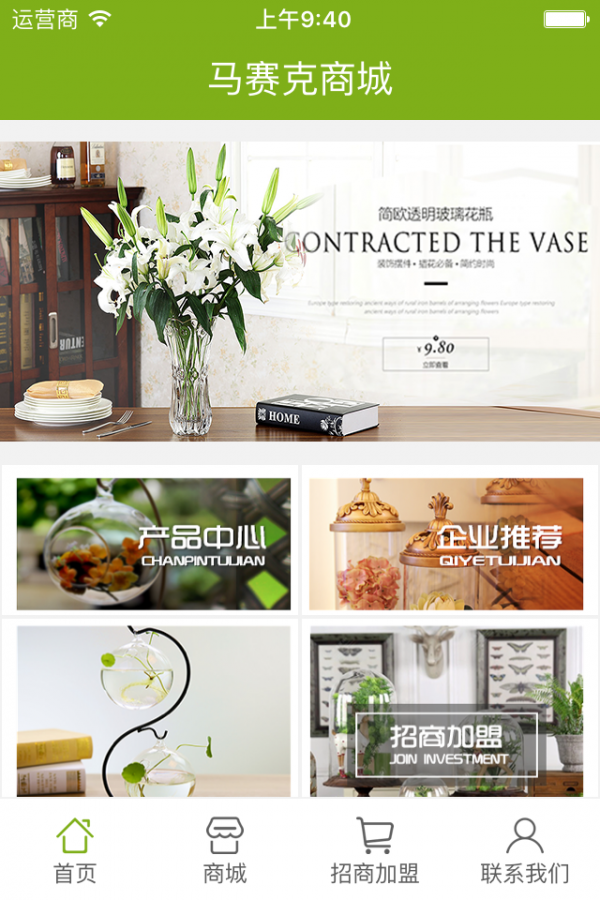 马赛克商城以绿色为主色调,更能突显美感,该客户端向广大客户展示了一个大型的马赛克移动互联网门户平台,以便捷的浏览方式、强大的应用功能,最新的资讯信息,为广大客户提供了一个丰富的马赛克信息平台。
