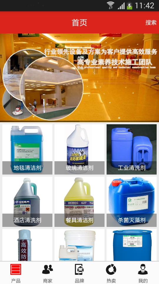 【产品】详尽展示了包括地毯清洁剂、玻璃清洁剂、工业清洗剂、酒店清洗剂、餐具清洁剂、防锈剂、除胶剂、除锈水、清洁设备、等各个细分类类别产品图文详情;瀑布流产品布局,产品详情带电商收藏、购物、电话垂询、图片分享等功能;