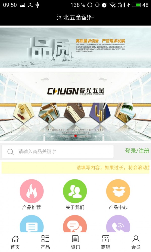 河北五金配件app不仅具备购物、查询订单、搜索商品、行业资讯和产品评价等常用功能,而且还实现了手机版特有的会员注册登录、广告位、招商开店等功能。目标是整合当地品牌商、生产商、经销商,为商家和消费者之间提供一站式解决案。
