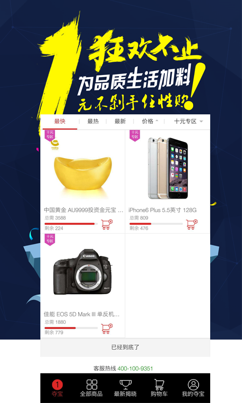 夺宝欢乐购是一种全新的互动购物体验方式,能满足个性、年轻消费者的购物需求,是时尚 、潮流的风向标。 夺宝欢乐购是把每件商品参考市场价平分成相应“等份”,每份1元,1份对应1个云购码,同一件商品可以购买多次或一次购买多份,当一件商品所有“等份”全部售出后计算出“幸运云购码”,拥有“幸运云购码”者即可获得此商品。