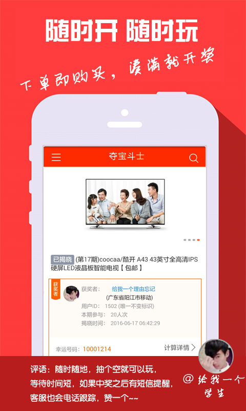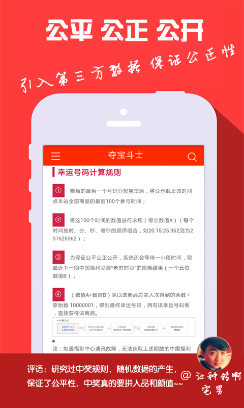 夺宝斗士app是一款网络购物应用,是杭州网俊网络科技有限公司推出的1元购平台。夺宝斗士app,这是个让你花费1快钱就有几率获取价值上千产品的众筹平台。