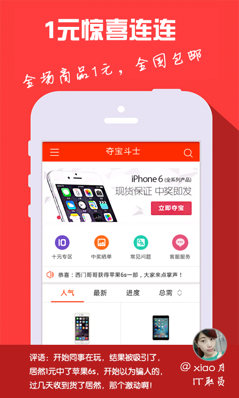 上百种新鲜潮流商品等着你,统统只需一元。一元中手机,中相机,中电脑,出国旅游统统不是梦。