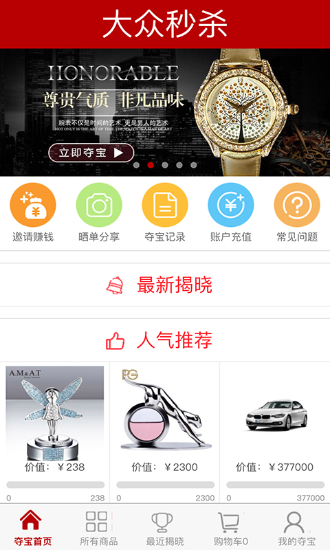 大众秒杀app是一款电商购物应用,用户可以通过软件体验当下最流行的一元夺宝玩法,让用户只花一元钱就能买到想要的商品,感受众筹购物带来的实惠。