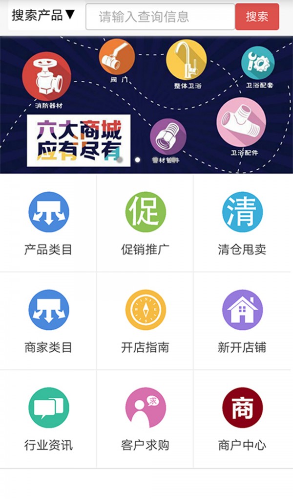 六大批发商城组合(整体卫浴商城,卫浴配件商城,卫浴配套商城,阀门商城,管材管件商城,消防器材商城),100%厂家直销价,一站式专业水暖,卫浴采购批发平台.