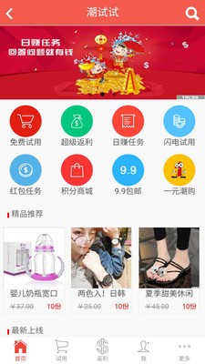潮试试app是一款网络购物应用,是揭阳潮划算电子商务有限公司自主开发运营的移动平台。潮试试app支持线上选购、支付功能,可为大家提供免费试用和做任务拿积分等服务。