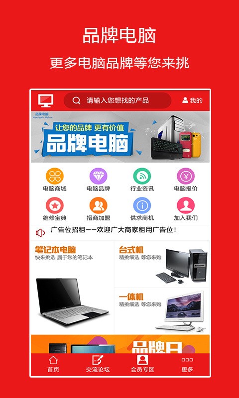品牌电脑是一款为广大用户提供多款品牌电脑的APP客户端。其中包含电脑商城、电脑品牌、行业资讯、电脑报价、维修宝典、供求商机等栏目。