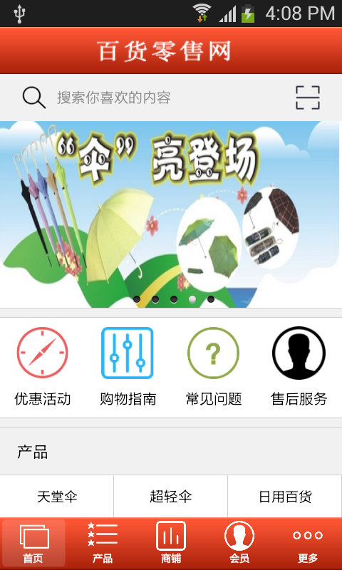 百货零售网app是一款手机购物商城,主要销售天堂伞、超轻伞及日用百货,参与优惠活动,价格更优惠,还能享受完善的售后服务。