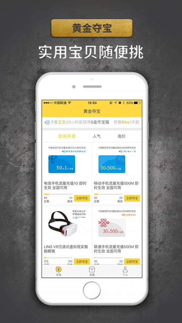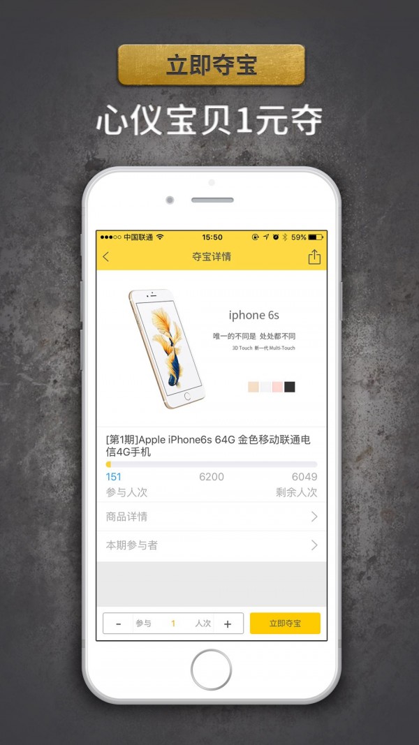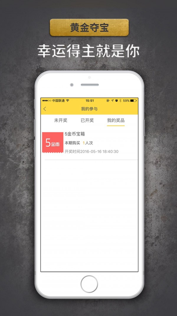 黄金夺宝app是款以1元购为核心运营的移动应用,由北京亚美云和科技有限公司全力打造,致力于于让你享受公平、公正发夺宝服务。