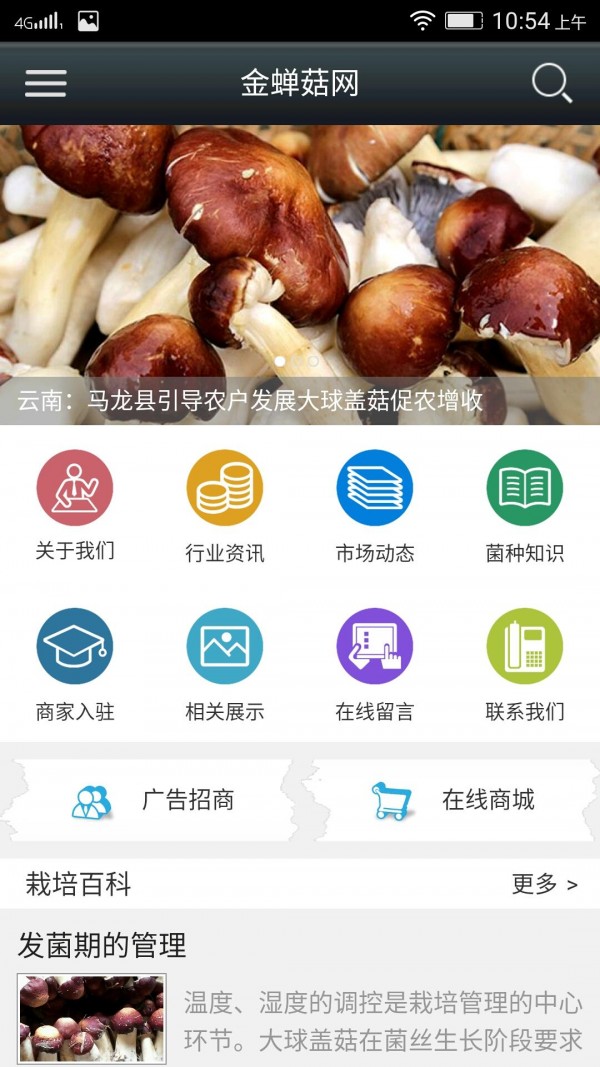 金蝉菇网app是一款网络购物应用,是个专注于金蝉菇相关服务的移动平台。在这里用户不但可及时了解金蝉菇行业资讯信息、市场动态和菌种详情,还能在线选购金蝉菇商品等。