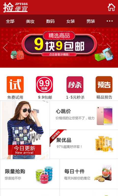 捡便宜app手机购物快捷方便,省钱省时。都是精选高品质产品,想你所享,购您所够! 美妆、数码、女装、男装、鞋品、箱包、居家、母婴、美食、文体和家电等集成一体,品类齐全,优惠到家。我们天天有更新,天天有优惠,欢迎大家购买到高品质的产品。