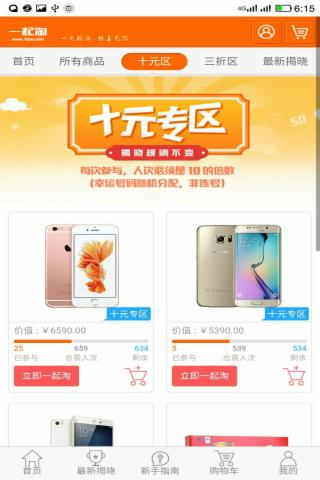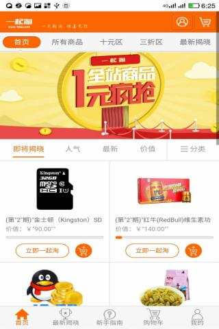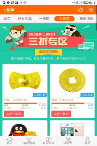 一起淘app是深圳鲜淘科技有限公司开发运营的1元购平台,在这里出售的商品不管100的充值卡,还是上千的手机都是只需1元用户就有几率获得。