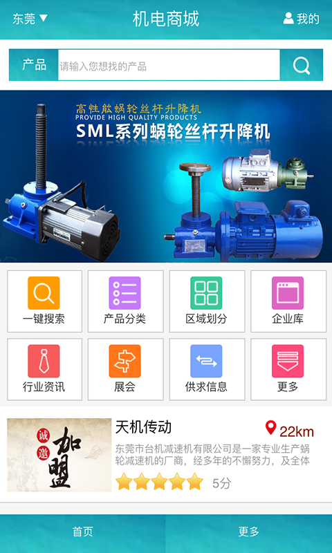机电商城app是一款专业提供机电设备购买的信息服务平台。机电商城app包括有产品分类、区域划分、企业库、展会等功能,期待您的咨询与加盟!