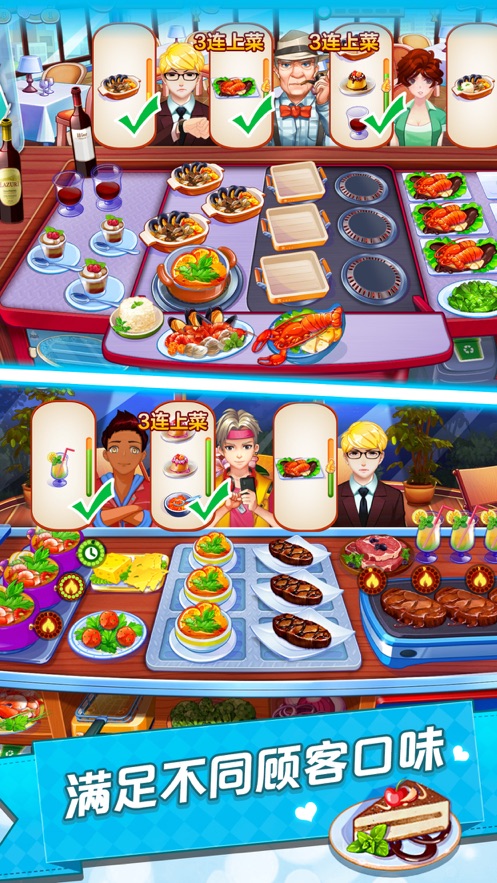 1、提供美食并赚取金币,你可以用攒下的金币来购买更多道具升级厨房;