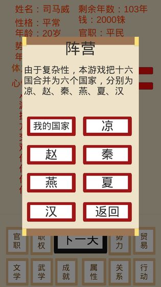 你可以选择入朝为官,造福百姓,或为一介平民,与世无争,你可以成为一名文臣,辅佐君王,或成为一名武将,征战天下,更多的精彩人生等你来探索!